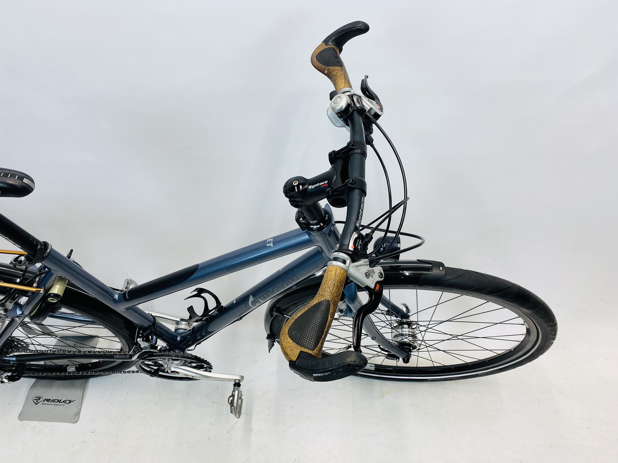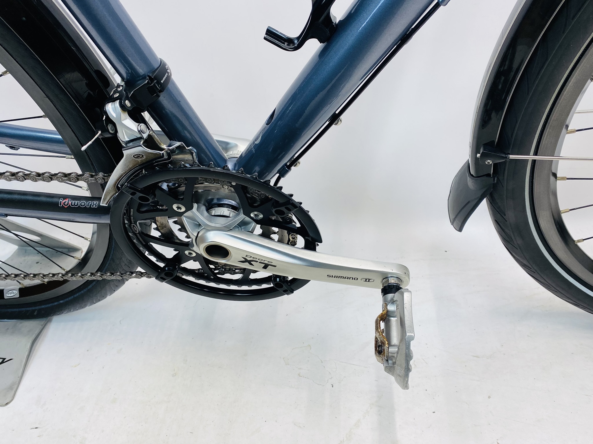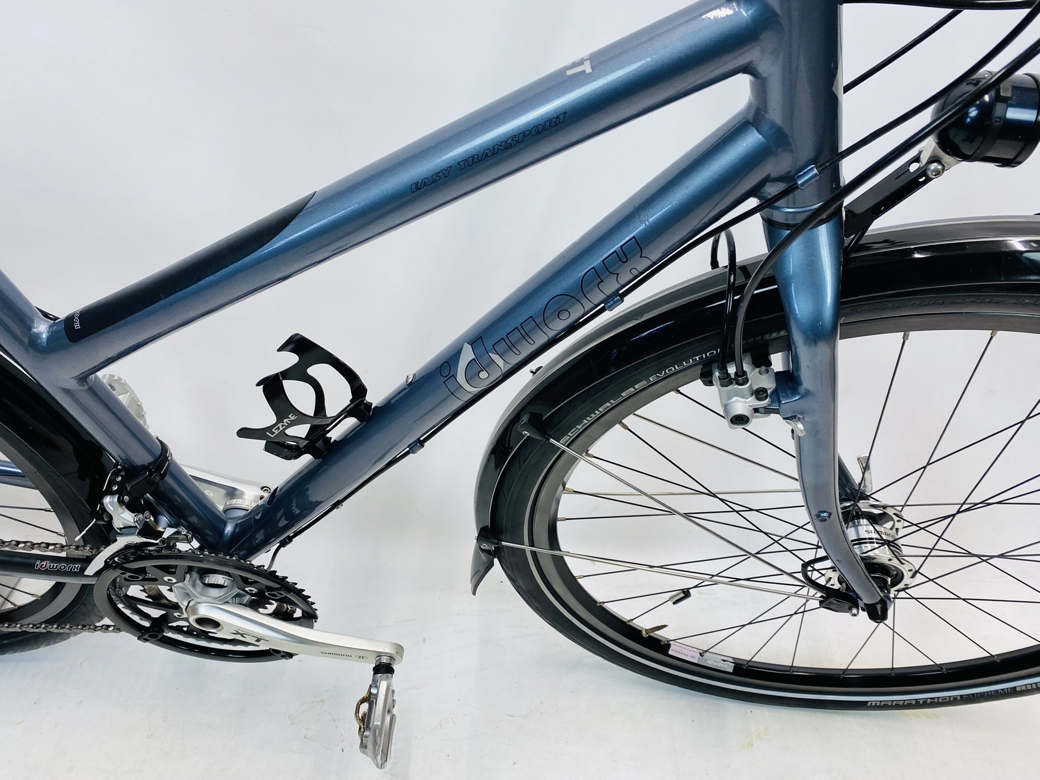 Refurbished IDWORX Easy Transport damesfiets L-57cm met 6 maanden garantie, framemaat geschikt voor 170 cm – 185 cm. Afgemonteerd met Shimano Deore XT ketting / derailler (30 versnellingen). Automatisch met naafdynamo & batterij van Shimano Deore (naaf dynamo).