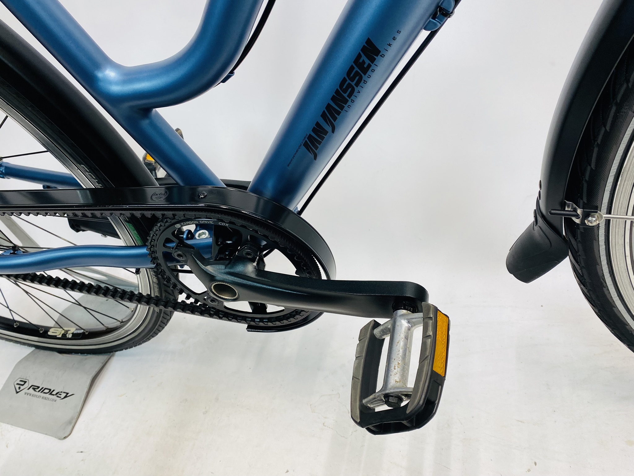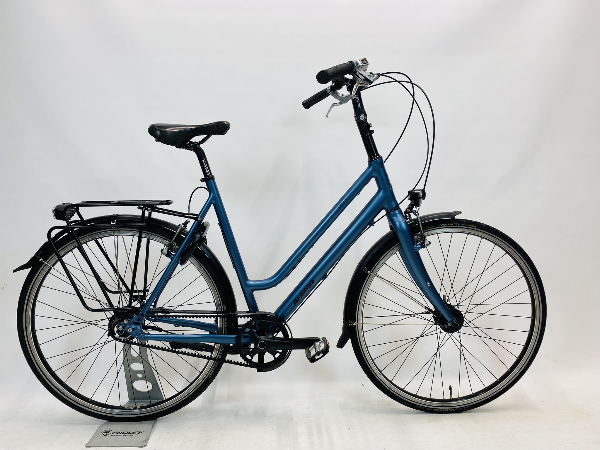 Refurbished JanJanssen ZERO Co2 damesfiets L-57cm ALFINE-11+ Belt met 6 maanden garantie, framemaat geschikt voor 170 cm – 185 cm. Afgemonteerd met Shimano Alfine Belt / Riemaandrijving Gates CDX (11 versnellingen). Automatisch met naafdynamo & batterij van Shimano (naaf dynamo).