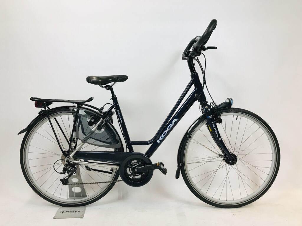 Refurbished KOGA Confidance DonkerBlauw damesfiets S-50cm met 6 maanden garantie, framemaat geschikt voor 128 cm – 140 cm. Afgemonteerd met een Shimano Deore (30 versnellingen).