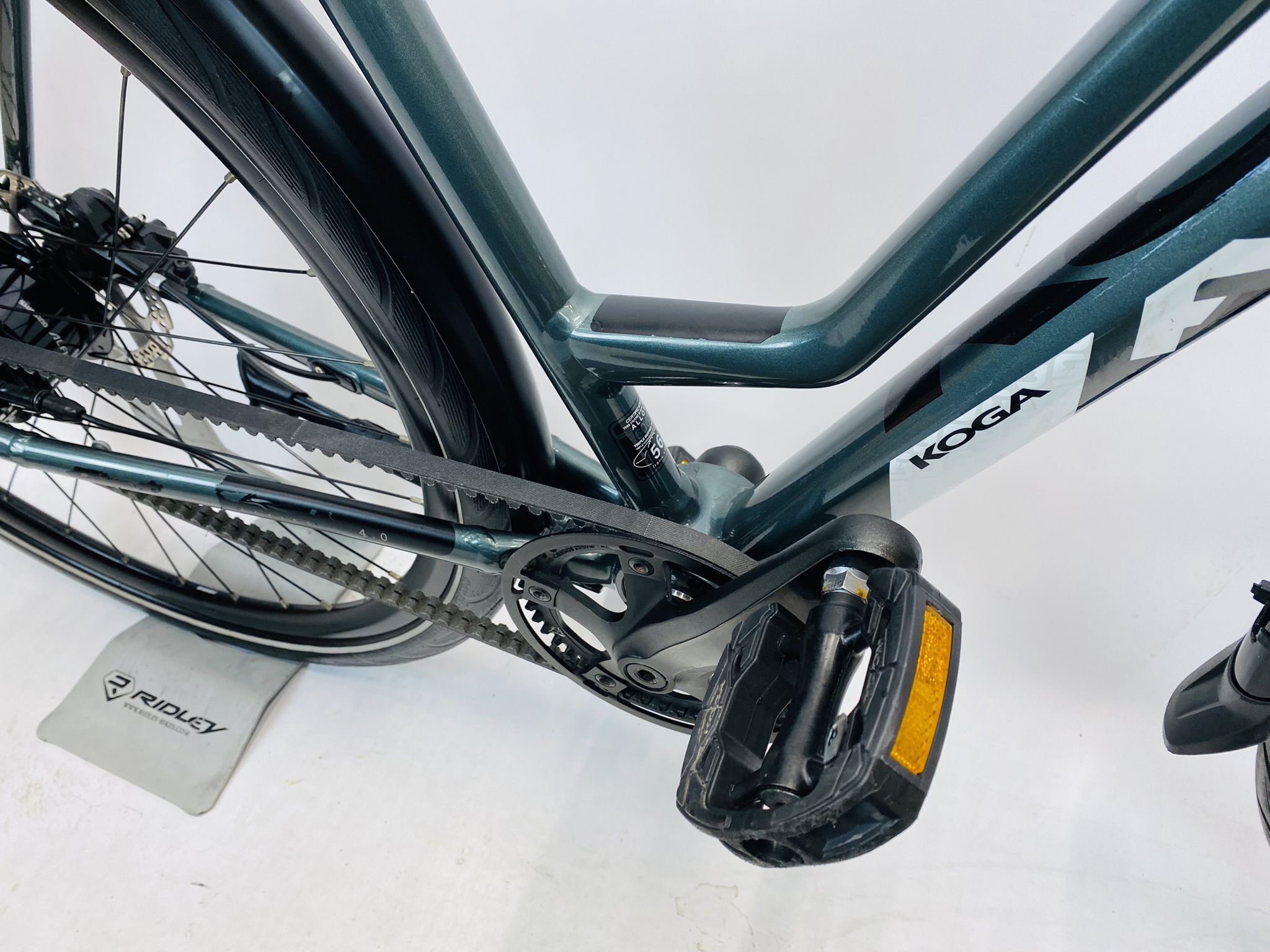 Refurbished KOGA F3 6 0 damesfiets L-56cm legergroen Naaydynamo+Alfine met 6 maanden garantie, framemaat geschikt voor 170 cm – 185 cm. Afgemonteerd met Shimano Alfine riemaandrijving (8 versnellingen). Automatisch met naafdynamo & batterij van Shimano (naaf dynamo).