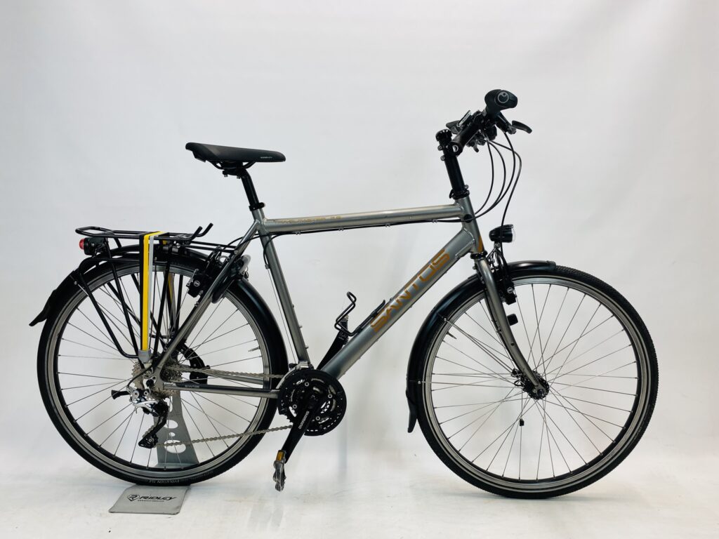 Refurbished SANTOS TravelMaster 28 herenfiets L-57cm met 6 maanden garantie, framemaat geschikt voor 170 cm – 185 cm. Afgemonteerd met Shimano Deore XT ketting / derailler (30 versnellingen). Automatisch met naafdynamo & batterij van Son (naafdynamo).