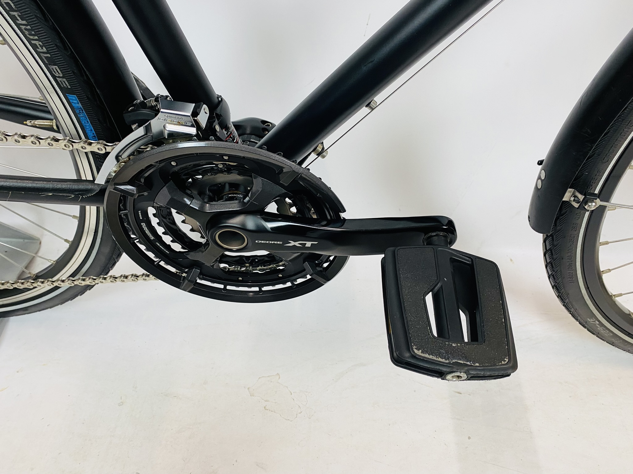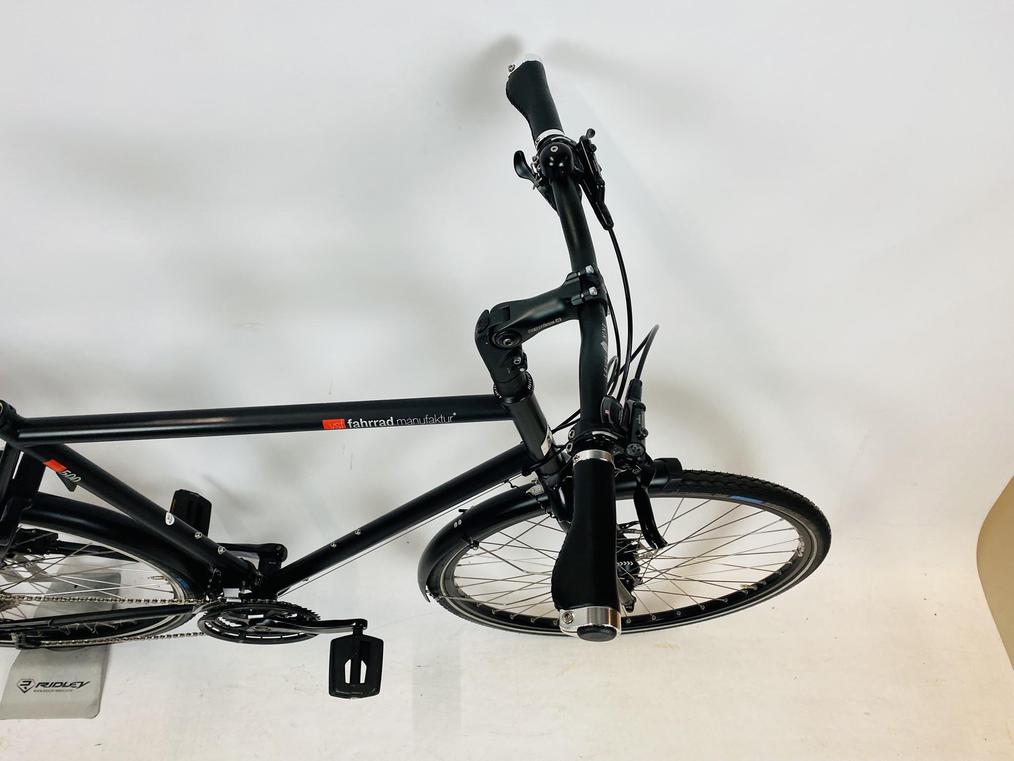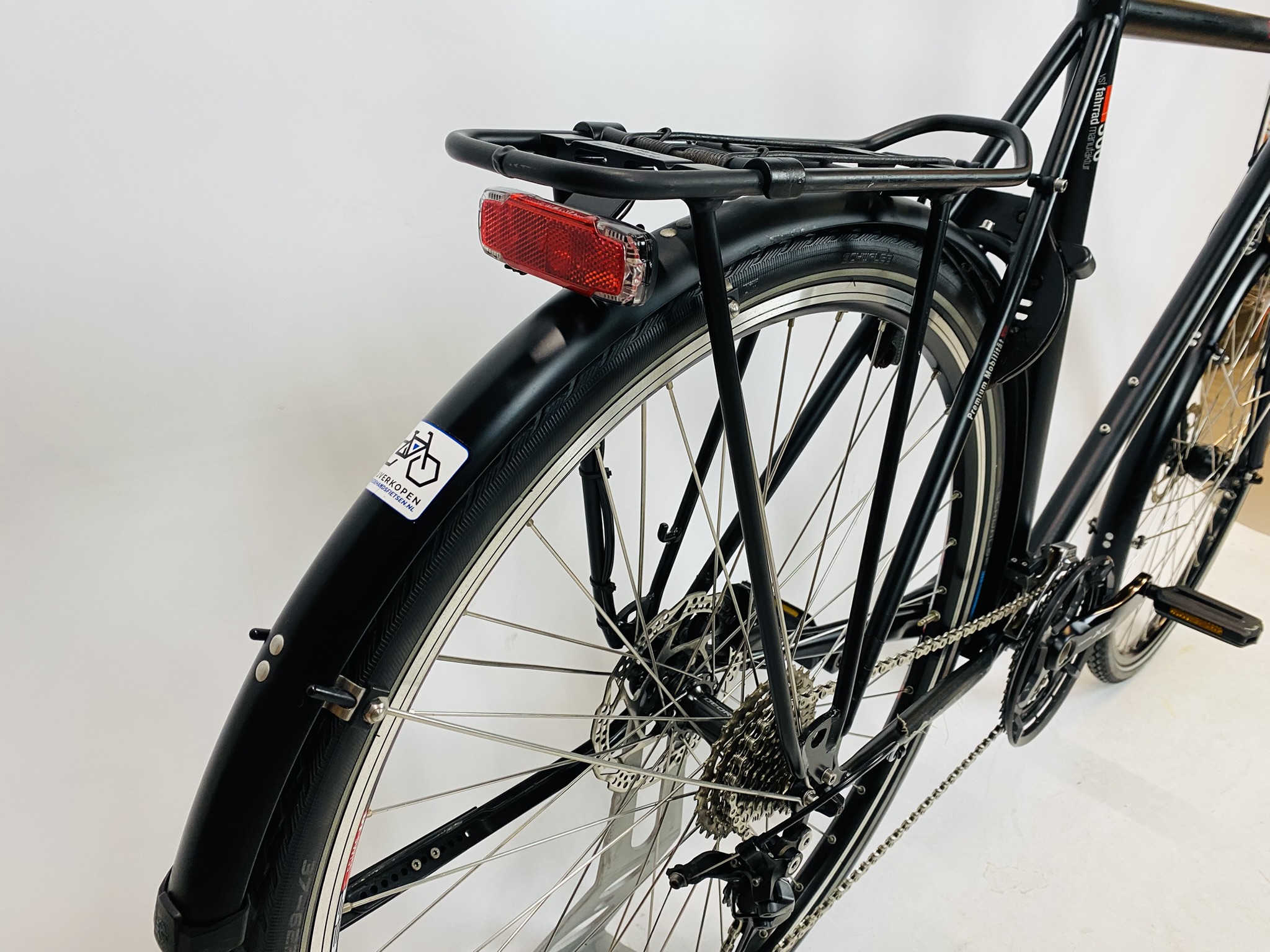 Refurbished VSF Fahrradmanufaktur T500 herenfiets XXL-62cm – Schijfrem+naafdynamo met 6 maanden garantie, framemaat geschikt voor 175 cm – 192 cm. Afgemonteerd met Shimano Deore XT – Deore ketting / derailler (30 versnellingen). Automatische verlichting van Shimano (naaf dynamo).
